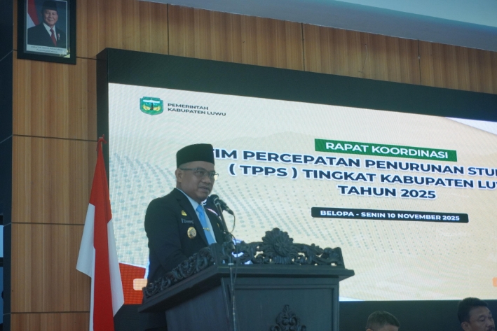 LUWU — Bupati Luwu, H. Patahudding, membuka secara resmi Rapat Koordinasi Tim Percepatan Penurunan Stunting (TPPS) Tingkat Kabupaten Luwu Tahun 2025, di Ruang Pola Kantor Bupati Luwu, Belopa, Senin (10/11/2025).