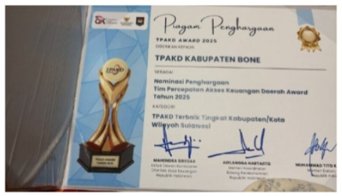 Penghargaan ini diterima langsung oleh Wakil Bupati Bone, H. Andi Akmal Pasluddin, dalam Rapat Koordinasi Nasional (Rakornas) Tim Percepatan Akses Keuangan Daerah (TPAKD) Tahun 2025 di Jakarta. Sabtu (11/10/2025)
